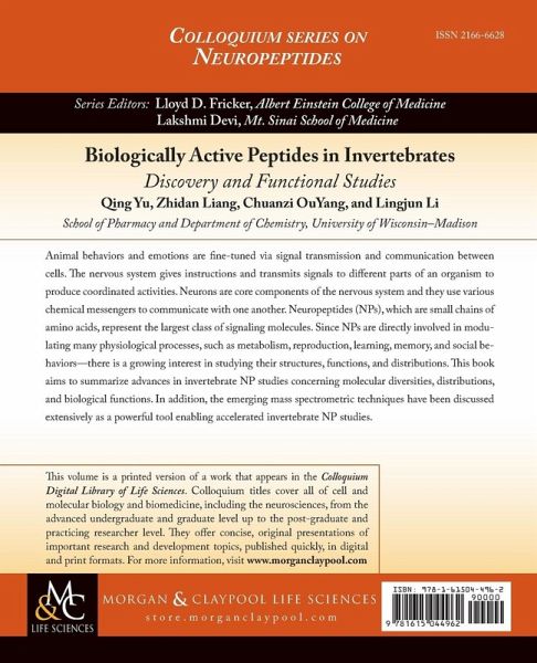 Animal behaviors and emotions are fine-tuned via signal transmission and communication between cells. The nervous system gives instructions and transmits signals to different parts of an organism to produce coordinated activities. Neurons are core components of the nervous system and they use various chemical messengers to communicate with one another. Neuropeptides (NPs), which are small chains of amino acids, represent the largest class of signaling molecules. Since NPs are directly involved in modulating many physiological processes, such as metabolism, reproduction, learning, memory, and social behaviors-there is a growing interest in studying their structures, functions, and distributions. This book aims to summarize advances in invertebrate NP studies concerning molecular diversities, distributions, and biological functions. In addition, the emerging mass spectrometric techniques have been discussed extensively as a powerful tool enabling accelerated invertebrate NP studies.