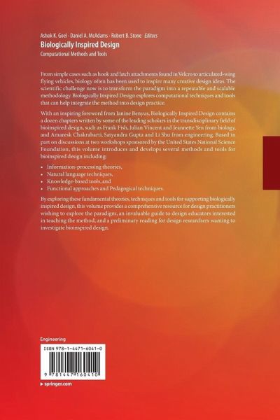 From simple cases such as hook and latch attachments found in Velcro to articulated-wing flying vehicles, biology often has been used to inspire many creative design ideas. The scientific challenge now is to transform the paradigm into a repeatable and scalable methodology. Biologically Inspired Design explores computational techniques and tools that can help integrate the method into design practice.