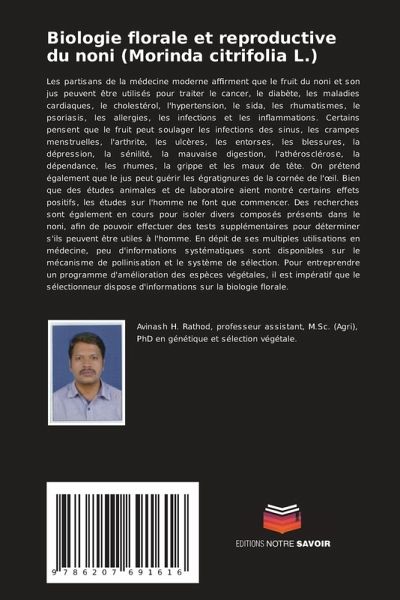 Les partisans de la médecine moderne affirment que le fruit du noni et son jus peuvent être utilisés pour traiter le cancer, le diabète, les maladies cardiaques, le cholestérol, l'hypertension, le sida, les rhumatismes, le psoriasis, les allergies, les infections et les inflammations. Certains pensent que le fruit peut soulager les infections des sinus, les crampes menstruelles, l'arthrite, les ulcères, les entorses, les blessures, la dépression, la sénilité, la mauvaise digestion, l'athérosclérose, la dépendance, les rhumes, la grippe et les maux de tête. On prétend également que le jus peut guérir les égratignures de la cornée de l'oeil. Bien que des études animales et de laboratoire aient montré certains effets positifs, les études sur l'homme ne font que commencer. Des recherches sont également en cours pour isoler divers composés présents dans le noni, afin de pouvoir effectuer des tests supplémentaires pour déterminer s'ils peuvent être utiles à l'homme. En dépit de ses multiples utilisations en médecine, peu d'informations systématiques sont disponibles sur le mécanisme de pollinisation et le système de sélection. Pour entreprendre un programme d'amélioration des espèces végétales, il est impératif que le sélectionneur dispose d'informations sur la biologie florale.