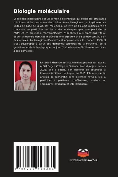 La biologie moléculaire est un domaine scientifique qui étudie les structures chimiques et les processus des phénomènes biologiques qui impliquent les unités de base de la vie, les molécules. Ce livre de biologie moléculaire se concentre en particulier sur les acides nucléiques (par exemple l'ADN et l'ARN) et les protéines, macromolécules essentielles aux processus vitaux, et sur la manière dont ces molécules interagissent et se comportent au sein des cellules. La biologie moléculaire est apparue dans les années 1930 et s'est développée à partir des domaines connexes de la biochimie, de la génétique et de la biophysique ; aujourd'hui, elle reste étroitement associée à ces domaines.