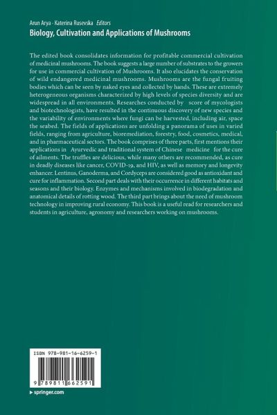 The edited book consolidates information for profitable commercial cultivation of medicinal mushrooms. The book suggests a large number of substrates to the growers for use in commercial cultivation of Mushrooms. It also elucidates the conservation of wild endangered medicinal mushrooms. Mushrooms are the fungal fruiting bodies which can be seen by naked eyes and collected by hands. These are extremely heterogeneous organisms characterized by high levels of species diversity and are widespread in all environments. Researches conducted by score of mycologists and biotechnologists, have resulted in the continuous discovery of new species and the variability of environments where fungi can be harvested, including air, space the seabed. The fields of applications are unfolding a panorama of uses in varied fields, ranging from agriculture, bioremediation, forestry, food, cosmetics, medical, and in pharmaceutical sectors. The book comprises of three parts, first mentions their applications in Ayurvedic and traditional system of Chinese medicine for the cure of ailments. The truffles are delicious, while many others are recommended, as cure in deadly diseases like cancer, COVID-19, and HIV, as well as memory and longevity enhancer. Lentinus, Ganoderma, and Cordyceps are considered good as antioxidant and cure for inflammation. Second part deals with their occurrence in different habitats and seasons and their biology. Enzymes and mechanisms involved in biodegradation and anatomical details of rotting wood. The third part brings about the need of mushroom technology in improving rural economy. This book is a useful read for researchers and students in agriculture, agronomy and researchers working on mushrooms.
