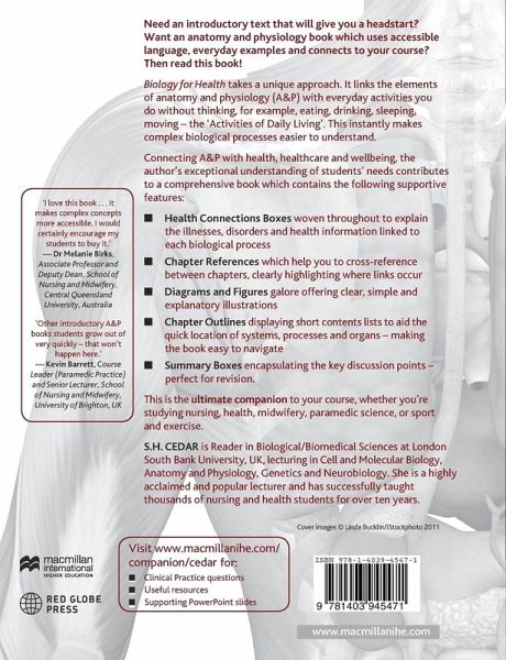 This textbook takes a unique approach by linking the elements of anatomy and physiology (A&P) with everyday activities we all do without thinking, the 'Activities of Daily Living' such as breathing or eating, in order to explain biological systems and making complex ideas and biological processes easier to understand and relate to practice. By connecting A&P with health, healthcare and wellbeing, the author's exceptional understanding of students' needs contributes to a comprehensive book.