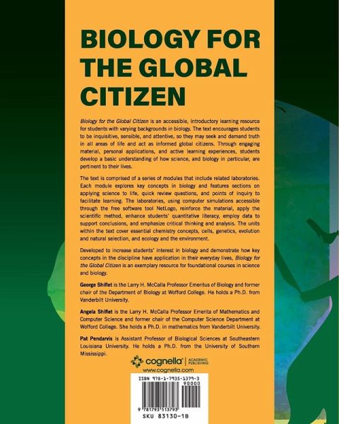 Biology for the Global Citizen is an accessible, introductory learning resource for students with varying backgrounds in biology. The text encourages students to be inquisitive, sensible, and attentive, so they may seek and demand truth in all areas of life and act as informed global citizens. Through engaging material, personal applications, and active learning experiences, students develop a basic understanding of how science, and biology in particular, are pertinent to their lives. The text is comprised of a series of modules that include related laboratories. Each module explores key concepts in biology and features sections on applying science to life, quick review questions, and points of inquiry to facilitate learning. The laboratories, using computer simulations accessible through the free software tool NetLogo, reinforce the material, apply the scientific method, enhance students' quantitative literacy, employ data to support conclusions, and emphasize critical thinking and analysis. The units within the text cover essential chemistry concepts, cells, genetics, evolution and natural selection, and ecology and the environment. Developed to increase students' interest in biology and demonstrate how key concepts in the discipline have application in their everyday lives, Biology for the Global Citizen is an exemplary resource for foundational courses in science and biology.