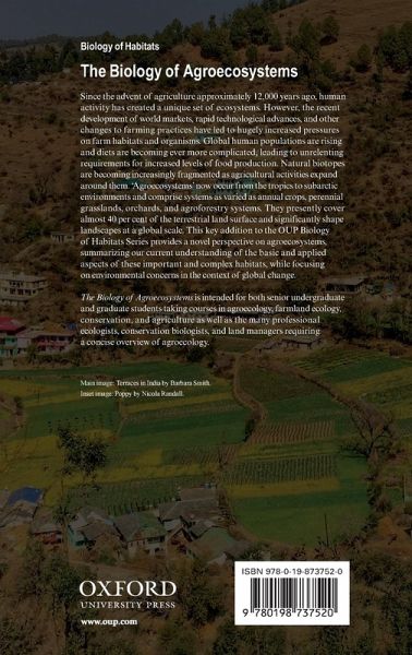 Since the advent of agriculture approximately 12,000 years ago, human activity has created a unique set of ecosystems. However, the recent development of world markets, rapid technological advances, and other changes to farming practices have led to hugely increased pressures on farm habitats and organisms. Global human populations are rising and diets are becoming ever more complicated, leading to unrelenting requirements for increased levels of food production. Natural biotopes are becoming increasingly fragmented as agricultural activities expand around them. "Agroecosystems" now occur from the tropics to subarctic environments and comprise systems as varied as annual crops, perennial grasslands, orchards, and agroforestry systems. They presently cover almost 40% of the terrestrial land surface and significantly shape landscapes at a global scale. This key addition to the OUP Biology of Habitats Series provides a novel perspective on agroecosystems, summarising our current understanding of the basic and applied aspects of these important and complex habitats, whilst focusing on environmental concerns in the context of global change. The Biology of Agroecosystemsis is for both senior undergraduate and graduate students taking courses in agroecology, farmland ecology, conservation, and agriculture as well as the many professional ecologists, conservation biologists, and land managers requiring a concise overview of agroecology.
