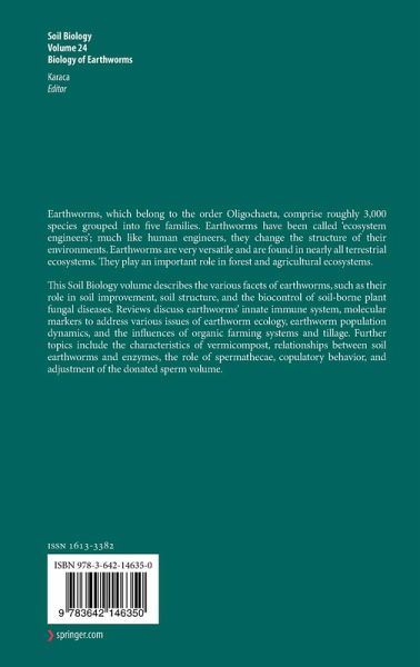 Earthworms, which belong to the order Oligochaeta, comprise roughly 3,000 species grouped into five families. Earthworms have been called 'ecosystem engineers'; much like human engineers, they change the structure of their environments. Earthworms are very versatile and are found in nearly all terrestrial ecosystems. They play an important role in forest and agricultural ecosystems.This Soil Biology volume describes the various facets of earthworms, such as their role in soil improvement, soil structure, and the biocontrol of soil-borne plant fungal diseases. Reviews discuss earthworms' innate immune system, molecular markers to address various issues of earthworm ecology, earthworm population dynamics, and the influences of organic farming systems and tillage. Further topics include the characteristics of vermicompost, relationships between soil earthworms and enzymes, the role of spermathecae, copulatory behavior, and adjustment of the donated sperm volume.