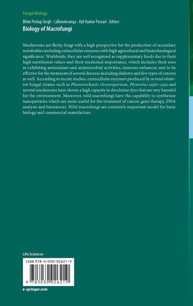 Preface.- Exploration of macrofungi in sub-tropical semi-evergreen Indian forest ecosystems.- A Global Overview of Edible Mushrooms.- Molecular characterization of wild mushrooms: a paradigm shift from morphotyping.- Antimicrobial and hepatoprotective activities of edible mushrooms.- Mushroom-mediated Protection from Oxidative Damage to DNA.- Chemical and bioactive profiling of wild edible mushrooms.- Biotechnological requirements for the commercial cultivation of macrofungi: substrate and casing layer.- Role of mushroom fungi in decolourization of industrial dyes and degradation of agrochemicals.- Mushrooms: Isolation and purification of exopolysaccharides.- Novel prospective of wild mushroom polysaccharides as potential prebiotics.- Pharmaceutic prodigy of ergosterol and protein profile of Ganoderma lucidum.- Application of Wild Macrofungi as Anticancer Therapeutics.- Recent advances in cultivation of edible mushrooms.- Medicinal mushrooms: Cultivation and pharmaceutical impact.- Biological control of microbial pathogens in edible mushrooms.- Cordycepin: A biotherapeutic molecule from medicinal mushroom.- Biosynthesis of Nanoparticles using Mushrooms.- Bioconversion and Biotransformation Efficiencies of Wild Macrofungi.- Wild macro-fungi from Northwest Himalayas: Future prospects and challenges.- Index.