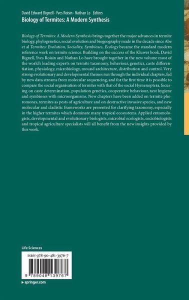 Biology of Termites, a Modern Synthesis brings together the major advances in termite biology, phylogenetics, social evolution and biogeography made in the decade since Abe et al Termites: Evolution, Sociality, Symbioses, Ecology became the standard modern reference work on termite science. Building on the success of the Kluwer book, David Bignell, Yves Roisin and Nathan Lo have brought together in the new volume most of the world s leading experts on termite taxonomy, behaviour, genetics, caste differentiation, physiology, microbiology, mound architecture, distribution and control. Very strong evolutionary and developmental themes run through the individual chapters, fed by new data streams from molecular sequencing, and for the first time it is possible to compare the social organisation of termites with that of the social Hymenoptera, focusing on caste determination, population genetics, cooperative behaviour, nest hygiene and symbioses with microorganisms. New chapters have been added on termite pheromones, termites as pests of agriculture and on destructive invasive species, and new molecular and cladistic frameworks are presented for clarifying taxonomy, especially in the higher termites which dominate many tropical ecosystems. Applied entomologists, developmental and evolutionary biologists, microbial ecologists, sociobiologists and tropical agriculture specialists will all benefit from the new insights provided by this work.