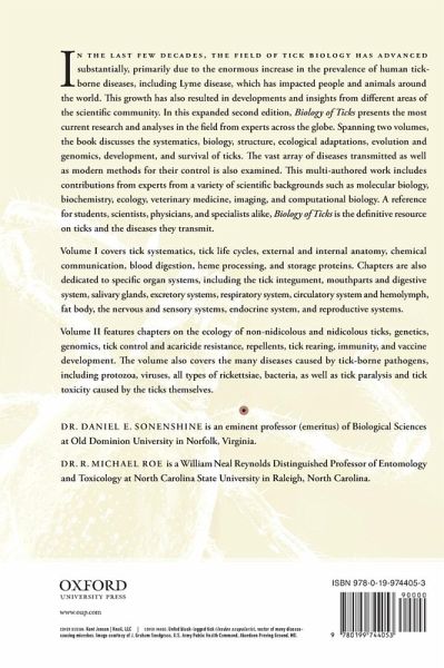 Biology of Ticks is the most comprehensive work on tick biology and tick-borne diseases. This second edition is a multi-authored work, featuring the research and analyses of renowned experts across the globe. Spanning two volumes, the book examines the systematics, biology, structure, ecological adaptations, evolution, genomics and the molecular processes that underpin the growth, development and survival of these important disease-transmitting parasites. Also discussed is the remarkable array of diseases transmitted (or caused) by ticks, as well as modern methods for their control. This book should serve as a modern reference for students, scientists, physicians, veterinarians and other specialists. Volume I covers the biology of the tick and features chapters on tick systematics, tick life cycles, external and internal anatomy, and others dedicated to specific organ systems, specifically, the tick integument, mouthparts and digestive system, salivary glands, waste removal, salivary glands, respiratory system, circulatory system and hemolymph, fat body, the nervous and sensory systems and reproductive systems. Volume II includes chapters on the ecology of non-nidicolous and nidicolous ticks, genetics and genomics (including the genome of the Lyme disease vector Ixodes scapularis) and immunity, including host immune responses to tick feeding and tick-host interactions, as well as the tick's innate immune system that prevents and/or controls microbial infections. Six chapters cover in depth the many diseases caused by the major tick-borne pathogens, including tick-borne protozoa, viruses, rickettsiae of all types, other types of bacteria (e.g., the Lyme disease agent) and diseases related to tick paralytic agents and toxins. The remaining chapters are devoted to tick control using vaccines, acaricides, repellents, biocontrol, and, finally, techniques for breeding ticks in order to develop tick colonies for scientific study.