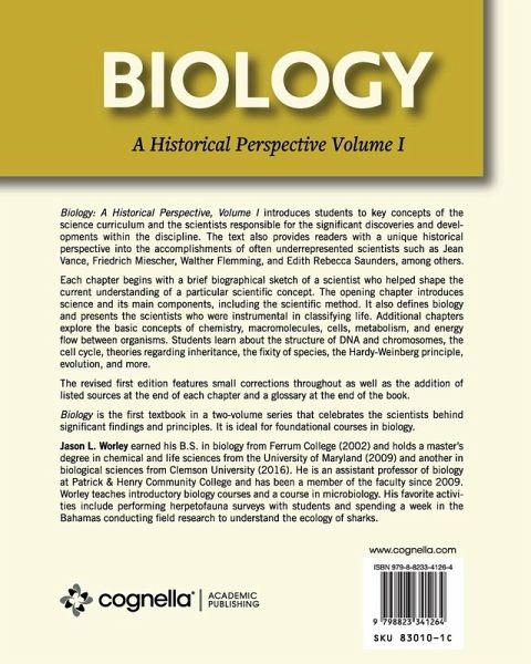 Biology: A Historical Perspective, Volume I introduces students to key concepts of the science curriculum and the scientists responsible for the significant discoveries and developments within the discipline. The text also provides readers with a unique historical perspective into the accomplishments of often underrepresented scientists such as Jean Vance, Friedrich Miescher, Walther Flemming, and Edith Rebecca Saunders, among others. Each chapter begins with a brief biographical sketch of a scientist who helped shape the current understanding of a particular scientific concept. The opening chapter introduces science and its main components, including the scientific method. It also defines biology and presents the scientists who were instrumental in classifying life. Additional chapters explore the basic concepts of chemistry, macromolecules, cells, metabolism, and energy flow between organisms. Students learn about the structure of DNA and chromosomes, the cell cycle, theories regarding inheritance, the fixity of species, the Hardy-Weinberg principle, evolution, and more. The revised first edition features small corrections throughout as well as the addition of listed sources at the end of each chapter and a glossary at the end of the book. Biology is the first textbook in a two-volume series that celebrates the scientists behind significant findings and principles. It is ideal for foundational courses in biology.