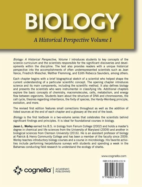 Biology: A Historical Perspective, Volume I introduces students to key concepts of the science curriculum and the scientists responsible for the significant discoveries and developments within the discipline. The text also provides readers with a unique historical perspective into the accomplishments of often underrepresented scientists such as Jean Vance, Friedrich Miescher, Walther Flemming, and Edith Rebecca Saunders, among others. Each chapter begins with a brief biographical sketch of a scientist who helped shape the current understanding of a particular scientific concept. The opening chapter introduces science and its main components, including the scientific method. It also defines biology and presents the scientists who were instrumental in classifying life. Additional chapters explore the basic concepts of chemistry, macromolecules, cells, metabolism, and energy flow between organisms. Students learn about the structure of DNA and chromosomes, the cell cycle, theories regarding inheritance, the fixity of species, the Hardy-Weinberg principle, evolution, and more. The revised first edition features small corrections throughout as well as the addition of listed sources at the end of each chapter and a glossary at the end of the book. Biology is the first textbook in a two-volume series that celebrates the scientists behind significant findings and principles. It is ideal for foundational courses in biology.