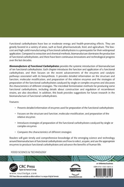 Chapter 1 Functional carbohydrates and their manufacturing strategies Chuqi Feng Lingqia Su Lei Wang Zhengfei Yana Jing Wu Chapter 2 Resistant dextrin/Isomaltodextrin Lijun Zhao Mingjing Sun Wei Xia Lei Wang Jing Wu Lingqia Su Chapter 3 Isomaltooligosaccharides Minglei Hou Xingyu Zhou Lingqia Su Lei Wang Chapter 4 Gentiooligosaccharides Chapter 5 Nigerooligosaccharides and Kojioligosaccharides Siqi Chen Zhaoyuan Zhang Zhengfei Yan Jing Wu Wei Xia Chapter 6 Isomaltulose Yang Li Miaomiao Xue Kang Zhang Chapter 7 Trehalose Qisheng Fu Shujin Bai Yan Huang Jing Wu Lingqia Su Chapter 8 Turanose Mingjing Sun Huanliu Lin Jingjia Huang Yan Huang Lingqia Su Chapter 9 2'-fucosyllactose/3-fucosyllactose Luyao Wang Shengqi Gao Kang Zhang Jing Wu Chapter 10 LactöN¿neotetraose Mengwei Zhang Tongle Liu Sheng Chen Kang Zhang Chapter 11 Sialyllactose Bohan Cai Jing Wu Zhanzhi Liu