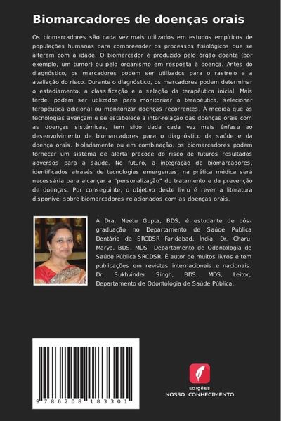 Os biomarcadores são cada vez mais utilizados em estudos empíricos de populações humanas para compreender os processos fisiológicos que se alteram com a idade. O biomarcador é produzido pelo órgão doente (por exemplo, um tumor) ou pelo organismo em resposta à doença. Antes do diagnóstico, os marcadores podem ser utilizados para o rastreio e a avaliação do risco. Durante o diagnóstico, os marcadores podem determinar o estadiamento, a classificação e a seleção da terapêutica inicial. Mais tarde, podem ser utilizados para monitorizar a terapêutica, selecionar terapêutica adicional ou monitorizar doenças recorrentes. À medida que as tecnologias avançam e se estabelece a inter-relação das doenças orais com as doenças sistémicas, tem sido dada cada vez mais ênfase ao desenvolvimento de biomarcadores para o diagnóstico da saúde e da doença orais. Isoladamente ou em combinação, os biomarcadores podem fornecer um sistema de alerta precoce do risco de futuros resultados adversos para a saúde. No futuro, a integração de biomarcadores, identificados através de tecnologias emergentes, na prática médica será necessária para alcançar a "personalização" do tratamento e da prevenção de doenças. Por conseguinte, o objetivo deste livro é rever a literatura disponível sobre biomarcadores relacionados com as doenças orais.