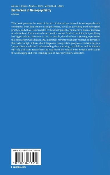 This book presents the 'state of the art' of biomarkers research in neuropsychiatric conditions, from dementia to eating disorders, as well as providing methodological, practical and ethical issues related to the development of biomarkers. Biomarkers have revolutionized clinical research and practice in most fields of medicine, but psychiatry has lagged behind. However, in the last decade, there has been a growing expectation that biomarkers will advance and, ultimately, reframe psychiatry research and practice. Biomarkers might inform about diagnosis, therapeutics, prognosis, contributing to a 'personalized medicine'. Understanding their meaning, possibilities and limitations will help clinicians, researchers and students in the related areas navigate and excel in the challenging and ever changing field of neuropsychiatric disorders.