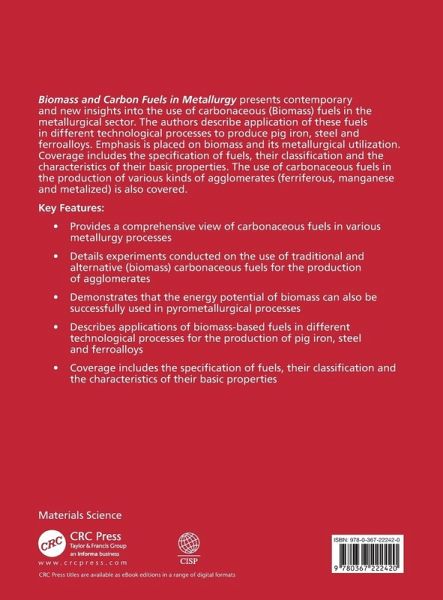 Biomass and Carbon Fuels in Metallurgy presents contemporary and new insights into the use of carbonaceous (Biomass) fuels in the metallurgical sector. The authors describe application of these fuels in different technological processes to produce pig iron, steel and ferroalloys. Emphasis is placed on biomass and its metallurgical utilization. Coverage includes the specification of fuels, their classification and the characteristics of their basic properties. The use of carbonaceous fuels in the production of various kinds of agglomerates (ferriferous, manganese and metalized) is also covered. Key Features: Provides a comprehensive view of carbonaceous fuels in various metallurgy processes Details experiments conducted on the use of traditional and alternative (biomass) carbonaceous fuels for the production of agglomerates. Demonstrates that the energy potential of biomass can also be successfully used in pyrometallurgical processes Describes applications of biomass-based fuels in different technological processes for the production of pig iron, steel and ferroalloys. Coverage includes the specification of fuels, their classification and the characteristics of their basic properties.
