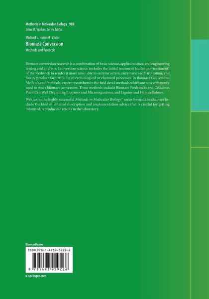 Biomass conversion research is a combination of basic science, applied science, and engineering testing and analysis. Conversion science includes the initial treatment (called pre-treatment) of the feedstock to render it more amenable to enzyme action, enzymatic saccharification, and finally product formation by microbiological or chemical processes. In Biomass Conversion: Methods and Protocols, expert researchers in the field detail methods which are now commonly used to study biomass conversion. These methods include Biomass Feedstocks and Cellulose, Plant Cell Wall Degrading Enzymes and Microorganisms, and Lignins and Hemicelluloses. Written in the highly successful Methods in Molecular Biology(TM) series format, the chapters include the kind of detailed description and implementation advice that is crucial for getting informed, reproducible results in the laboratory.