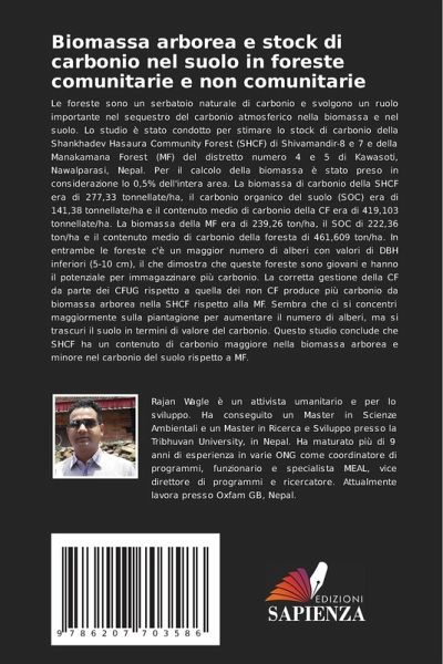 Le foreste sono un serbatoio naturale di carbonio e svolgono un ruolo importante nel sequestro del carbonio atmosferico nella biomassa e nel suolo. Lo studio è stato condotto per stimare lo stock di carbonio della Shankhadev Hasaura Community Forest (SHCF) di Shivamandir-8 e 7 e della Manakamana Forest (MF) del distretto numero 4 e 5 di Kawasoti, Nawalparasi, Nepal. Per il calcolo della biomassa è stato preso in considerazione lo 0,5% dell'intera area. La biomassa di carbonio della SHCF era di 277,33 tonnellate/ha, il carbonio organico del suolo (SOC) era di 141,38 tonnellate/ha e il contenuto medio di carbonio della CF era di 419,103 tonnellate/ha. La biomassa della MF era di 239,26 ton/ha, il SOC di 222,36 ton/ha e il contenuto medio di carbonio della foresta di 461,609 ton/ha. In entrambe le foreste c'è un maggior numero di alberi con valori di DBH inferiori (5-10 cm), il che dimostra che queste foreste sono giovani e hanno il potenziale per immagazzinare più carbonio. La corretta gestione della CF da parte dei CFUG rispetto a quella dei non CF produce più carbonio da biomassa arborea nella SHCF rispetto alla MF. Sembra che ci si concentri maggiormente sulla piantagione per aumentare il numero di alberi, ma si trascuri il suolo in termini di valore del carbonio. Questo studio conclude che SHCF ha un contenuto di carbonio maggiore nella biomassa arborea e minore nel carbonio del suolo rispetto a MF.