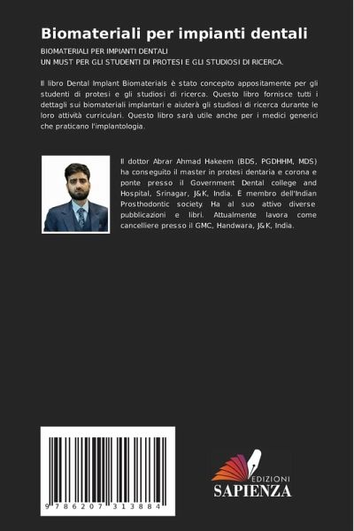 BIOMATERIALI PER IMPIANTI DENTALIUN MUST PER GLI STUDENTI DI PROTESI E GLI STUDIOSI DI RICERCA.Il libro Dental Implant Biomaterials è stato concepito appositamente per gli studenti di protesi e gli studiosi di ricerca. Questo libro fornisce tutti i dettagli sui biomateriali implantari e aiuterà gli studiosi di ricerca durante le loro attività curriculari. Questo libro sarà utile anche per i medici generici che praticano l'implantologia.