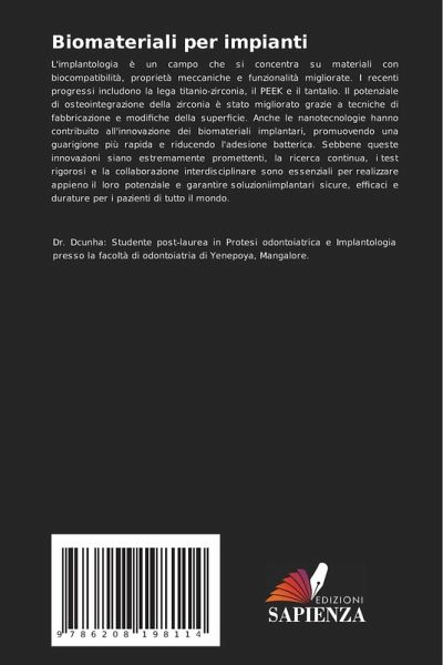 L'implantologia è un campo che si concentra su materiali con biocompatibilità, proprietà meccaniche e funzionalità migliorate. I recenti progressi includono la lega titanio-zirconia, il PEEK e il tantalio. Il potenziale di osteointegrazione della zirconia è stato migliorato grazie a tecniche di fabbricazione e modifiche della superficie. Anche le nanotecnologie hanno contribuito all'innovazione dei biomateriali implantari, promuovendo una guarigione più rapida e riducendo l'adesione batterica. Sebbene queste innovazioni siano estremamente promettenti, la ricerca continua, i test rigorosi e la collaborazione interdisciplinare sono essenziali per realizzare appieno il loro potenziale e garantire soluzioniimplantari sicure, efficaci e durature per i pazienti di tutto il mondo.