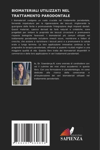 I biomateriali svolgono un ruolo cruciale nel trattamento parodontale, fornendo impalcature per la rigenerazione dei tessuti, migliorando la guarigione delle ferite e promuovendo l'integrazione degli impianti dentali. Questi materiali, spesso derivati da fonti naturali o sintetiche, sono progettati per imitare le proprietà dei tessuti circostanti e promuovere risposte biologiche favorevoli. I biomateriali più comuni utilizzati nel trattamento parodontale includono innesti ossei, membrane e fattori di crescita, che aiutano a ripristinare i tessuti persi e a promuovere la salute orale a lungo termine. La loro applicazione innovativa continua a far progredire la terapia parodontale, offrendo ai pazienti risultati migliori e una maggiore qualità di vita. Questo libro tratta dei biomateriali disponibili in commercio e della loro applicazione in vari trattamenti parodontali.