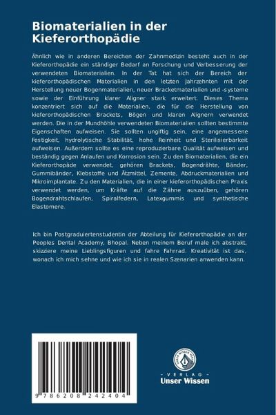 Ähnlich wie in anderen Bereichen der Zahnmedizin besteht auch in der Kieferorthopädie ein ständiger Bedarf an Forschung und Verbesserung der verwendeten Biomaterialien. In der Tat hat sich der Bereich der kieferorthopädischen Materialien in den letzten Jahrzehnten mit der Herstellung neuer Bogenmaterialien, neuer Bracketmaterialien und -systeme sowie der Einführung klarer Aligner stark erweitert. Dieses Thema konzentriert sich auf die Materialien, die für die Herstellung von kieferorthopädischen Brackets, Bögen und klaren Alignern verwendet werden. Die in der Mundhöhle verwendeten Biomaterialien sollten bestimmte Eigenschaften aufweisen. Sie sollten ungiftig sein, eine angemessene Festigkeit, hydrolytische Stabilität, hohe Reinheit und Sterilisierbarkeit aufweisen. Außerdem sollte es eine reproduzierbare Qualität aufweisen und beständig gegen Anlaufen und Korrosion sein. Zu den Biomaterialien, die ein Kieferorthopäde verwendet, gehören Brackets, Bogendrähte, Bänder, Gummibänder, Klebstoffe und Ätzmittel, Zemente, Abdruckmaterialien und Mikroimplantate. Zu den Materialien, die in einer kieferorthopädischen Praxis verwendet werden, um Kräfte auf die Zähne auszuüben, gehören Bogendrahtschlaufen, Spiralfedern, Latexgummis und synthetische Elastomere.