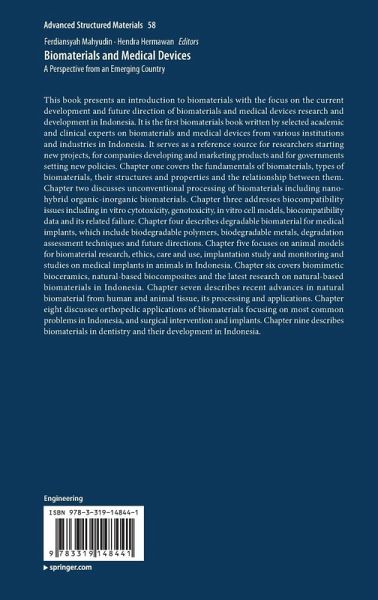 Chapter one covers the fundamentals of biomaterials, types of biomaterials, their structures and properties and the relationship between them. Chapter two discusses unconventional processing of biomaterials including nano-hybrid organic-inorganic biomaterials. Chapter three addresses biocompatibility issues including in vitro cytotoxicity, genotoxicity, in vitro cell models, biocompatibility data and its related failure. Chapter four describes degradable biomaterial for medical implants, which include biodegradable polymers, biodegradable metals, degradation assessment techniques and future directions. Chapter five focuses on animal models for biomaterial research, ethics, care and use, implantation study and monitoring and studies on medical implants in animals in Indonesia. Chapter six covers biomimetic bioceramics, natural-based biocomposites and the latest research on natural-based biomaterials in Indonesia. Chapter seven describes recent advances in natural biomaterial from human and animal tissue, its processing and applications. Chapter eight discusses orthopedic applications of biomaterials focusing on most common problems in Indonesia, and surgical intervention and implants. Chapter nine describes biomaterials in dentistry and their development in Indonesia.