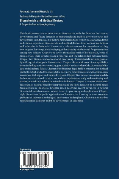 Chapter one covers the fundamentals of biomaterials, types of biomaterials, their structures and properties and the relationship between them. Chapter two discusses unconventional processing of biomaterials including nano-hybrid organic-inorganic biomaterials. Chapter three addresses biocompatibility issues including in vitro cytotoxicity, genotoxicity, in vitro cell models, biocompatibility data and its related failure. Chapter four describes degradable biomaterial for medical implants, which include biodegradable polymers, biodegradable metals, degradation assessment techniques and future directions. Chapter five focuses on animal models for biomaterial research, ethics, care and use, implantation study and monitoring and studies on medical implants in animals in Indonesia. Chapter six covers biomimetic bioceramics, natural-based biocomposites and the latest research on natural-based biomaterials in Indonesia. Chapter seven describes recent advances in natural biomaterial from human and animal tissue, its processing and applications. Chapter eight discusses orthopedic applications of biomaterials focusing on most common problems in Indonesia, and surgical intervention and implants. Chapter nine describes biomaterials in dentistry and their development in Indonesia.