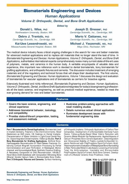 The medical device and drug industries standards in analytical methodology and are consistently among the strongest techno- quality control. logical performers. Materials are a key The users of Biomaterials Engineering ingredient in their dynamic growth. Devel- and Devices: Human Applications will r- opment of these materials is in a constant resent a broad base of backgrounds ranging state of activity, with the challenge of re- from the basic sciences (e. g. , polymer placing old materials that cannot withstand chemistry and biochemistry) to more the tests of time, and the new materials' applied disciplines (e. g. , mechanical/ needs coming to the forefront in modern chemical engineering, orthopedics, and applications. This new reference text, pharmaceutics). To meet varied needs, each Biomaterials Engineering and Devices: chapter provides clear ancd fully detailed Human Applications, focuses on materials discussions. This in-depth, but practical, used in or on the human body-materials coverage should also assist recent indu- that define the world of "biomaterials. " ees to the biomaterials circle. The editors Biomaterials Engineering and Devices: trust that this reference textbook conveys Human Applications focuses on mate- the intensity of this fast moving field in an rials development and characterization. enthusastic presentation. Chapters deal with issues in the selection of Donald L. Wise, PHD proper biomaterials from biocompatibility Debra J. Trantolo, PHD to biostability to structure/function relation- Kai-Uwe Lewandrowski, MD ships. Chapters also focus on the use of Joseph D. Gresser, PHD specific biomaterials based on their physio- Mario V.