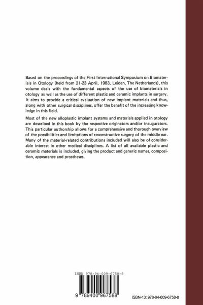 I History of Middle Ear Implants.- II Fundamental Aspects.- On alloplasts for otoloqy..- Behaviour of bioimplants in the middle ear..- Tissue response to porous materials used for ossicular replacement prostheses..- The closure of dural defects with Proplast..- Ceramic implant materials, possible applications and their limits..- Bioglass implants for otology..- Macor ceramics in soft and hard tissue..- Histological studies on the suitability of macor-ceramic implants..- Calciumphosphate ceramics: Biomaterials for middle ear implants..- Biodegradation of calciumphosphate ceramics-ultrastructural geometry and dissolubility of different calciumphosphate ceramics..- Hydroxyapatite in the infected middle ear..- An electrocochleographic study of the effect of plaster of Paris implanted in the middle ear of the guinea pig..- III Plastic Implants.- Columellar tympanoplasty..- TORPS and PORPS: Personal experiences A report on 446 operations..- Polyethylene TORPS and PORPS in otologic surgery..- Plastipore TORP with peg..- PORPs and TORPs versus allografts after five years..- Proplast and Plastipore in the middle ear..- Causes of ossiculoplasty failure using porous polyethylene (Plasti-Pore) prostheses..- Comparative study of different ossicular prostheses in tympanoplasty (Proplast, Plastipore, Ceravital). Analysis of clinical results, histopathological and hearing in the long term (250 cases)..- Plastipore prostheses for ossicular chain reconstruction in tympanoplasty..- The Histologic Appearance of Plastipore Ossicular Prostheses..- IV Ceramic Implants.- Otologic Surgery with Aluminiumoxide Ceramic Implants..- Aluminium ceramics as columella materials in ossicular reconstruction..- Current status of the development of Bioglass ossicular replacement implants..- Fundamental aspects of Bioglass and surgery with bioactive glass ceramic implants..- Our experience with Ceravital implants in middle ear surgery. (A middle term evaluation).- Macor ceramics in the middle ear..- Further observations on application of "Plasticin" in ear surgery. - six years of experience.- Are porous, tricalciumphosphate ceramic implants suitable for middle ear surgery? an experimental study of the pig's hypotympanon, with additional preliminary clinical results..- Tympanoplasty with calciumphosphate..- Use of sintered hydroxylapatite and inert collagen in middle ear surgery..- Three years of experience with ceramic prosthesis..- Ceramics in the reconstruction of the middle ear..- Fibrinogen glue and biocompatible prostheses..- V Materials.
