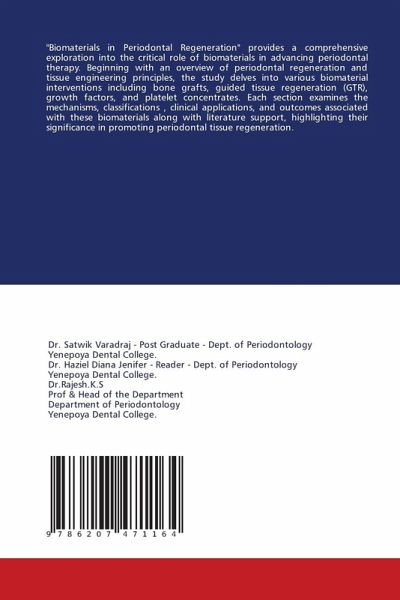 "Biomaterials in Periodontal Regeneration" provides a comprehensive exploration into the critical role of biomaterials in advancing periodontal therapy. Beginning with an overview of periodontal regeneration and tissue engineering principles, the study delves into various biomaterial interventions including bone grafts, guided tissue regeneration (GTR), growth factors, and platelet concentrates. Each section examines the mechanisms, classifications , clinical applications, and outcomes associated with these biomaterials along with literature support, highlighting their significance in promoting periodontal tissue regeneration.