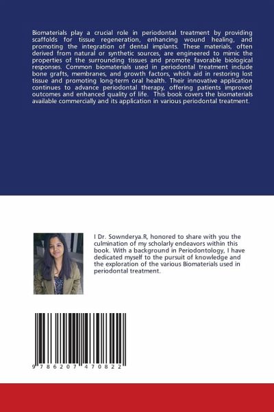 Biomaterials play a crucial role in periodontal treatment by providing scaffolds for tissue regeneration, enhancing wound healing, and promoting the integration of dental implants. These materials, often derived from natural or synthetic sources, are engineered to mimic the properties of the surrounding tissues and promote favorable biological responses. Common biomaterials used in periodontal treatment include bone grafts, membranes, and growth factors, which aid in restoring lost tissue and promoting long-term oral health. Their innovative application continues to advance periodontal therapy, offering patients improved outcomes and enhanced quality of life. This book covers the biomaterials available commercially and its application in various periodontal treatment.