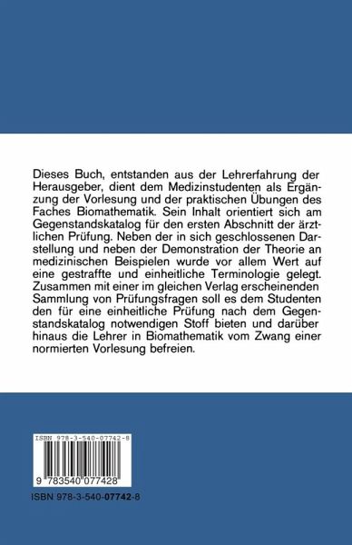1 Deskriptive Statistik.- 1.1 Merkmale, Urliste.- 1.2 Qualitative Merkmale.- 1.3 Quantitative Merkmale.- 1.4 Häufigkeitsmaße in der Medizinalstatistik.- 2 Wahrscheinlichkeitsrechnung.- 2.1 Grundbegriffe der Mengenlehre.- 2.2 Ereignisse.- 2.3 Wahrscheinlichkeiten.- 2.4 Rechnen mit Wahrscheinlichkeiten.- 2.5 Bedingte Wahrscheinlichkeit, Unabhängigkeit von Ereignissen.- 3 Zufallsvariable, Verteilungen.- 3.1 Zufallsvariable.- 3.2 Verteilungsfunktion, Wahrscheinlichkeitsfunktion, Dichte.- 3.3 Parameter einer Verteilungsfunktion.- 3.4 Unabhängige Zufallsvariable.- 3.5 Gesetz der großen Zahlen.- 4 Spezielle Verteilungen.- 4.1 Diskrete Verteilungen.- 4.2 Stetige Verteilungen.- 5 Versuchsplanung.- 5.1 Grundgesamtheit, Stichprobe.- 5.2 Zielgrößn, Einflußgrößen.- 5.3 Modell, Versuchsfehler.- 5.4 Methoden zur Beeinflussung des Versuchsfehlers.- 6 Schätz- und Testverfahren.- 6.1 Punktschätzung, Eigenschaften von Schätzfunktionen.- 6.2 IntervallSchätzung, Konfidenzintervall.- 6.3 Tests.- 6.4 Einteilung statistischer Tests.- 7 Spezielle Tests 153.- 7.1 Ein-Stichproben-Tests.- 7.2 Zwei-Stichproben-Tests.- 7.3 Mehr-Stichproben-Tests.- 7.4 Tests für Häufigkeiten von Ereignissen.- 7.5 Mehrfach-Vergleiche.- 7.6 Planung, Durchführung, Auswertung von Versuchen.- 8 Medizinische Informatik.- 8.1 Einführung.- 8.2 Ziele der Medizinischen Informatik.- 8.3 Datenverarbeitung.- 8.4 Aufgaben der Medizinischen Informatik.- 8.5 Dokumentation.- 9 Tabellen I-XI.- 10 Literatur.- 11 Sachwortregister.