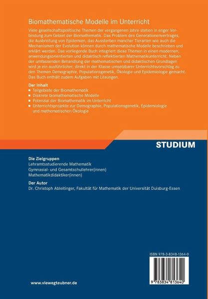 Viele gesellschaftspolitische Themen der vergangenen Jahre stehen in enger Verbindung zum Gebiet der Biomathematik. Das Problem des Generationenvertrages, die Ausbreitung von Epidemien, das Aussterben mancher Tierarten wie auch die Mechanismen der Evolution können durch mathematische Modelle beschrieben und erklärt werden. Das vorliegende Buch integriert diese Themen in einen modernen, anwendungsorientierten und didaktisch reflektierten Mathematikunterricht. Neben der umfassenden Behandlung der mathematischen und didaktischen Grundlagen wird je ein ausführlicher, direkt in der Klasse umsetzbarer Unterrichtsvorschlag zu den Themen Demographie, Populationsgenetik, Ökologie und Epidemiologie gemacht. Das Buch enthält zudem Aufgaben mit Lösungen.
