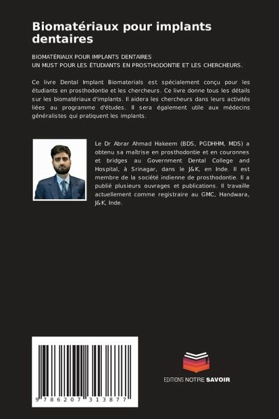 BIOMATÉRIAUX POUR IMPLANTS DENTAIRESUN MUST POUR LES ÉTUDIANTS EN PROSTHODONTIE ET LES CHERCHEURS.Ce livre Dental Implant Biomaterials est spécialement conçu pour les étudiants en prosthodontie et les chercheurs. Ce livre donne tous les détails sur les biomatériaux d'implants. Il aidera les chercheurs dans leurs activités liées au programme d'études. Il sera également utile aux médecins généralistes qui pratiquent les implants.