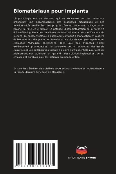 L'implantologie est un domaine qui se concentre sur les matériaux présentant une biocompatibilité, des propriétés mécaniques et des fonctionnalités améliorées. Les progrès récents concernent l'alliage titane-zircone, le PEEK et le tantale. Le potentiel d'ostéointégration de la zircone a été amélioré grâce à des techniques de fabrication et à des modifications de surface. La nanotechnologie a également contribué à l'innovation en matière de biomatériaux d'implants, en favorisant une cicatrisation plus rapide et en réduisant l'adhésion bactérienne. Bien que ces avancées soient extrêmement prometteuses, la poursuite de la recherche, des essais rigoureux et une collaboration interdisciplinaire sont essentiels pour réaliser pleinement leur potentiel et garantir des solutionsimplantaires sûres, efficaces et durables pour les patients du monde entier.