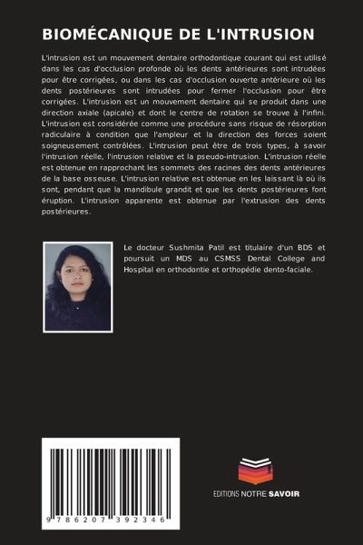 L'intrusion est un mouvement dentaire orthodontique courant qui est utilisé dans les cas d'occlusion profonde où les dents antérieures sont intrudées pour être corrigées, ou dans les cas d'occlusion ouverte antérieure où les dents postérieures sont intrudées pour fermer l'occlusion pour être corrigées. L'intrusion est un mouvement dentaire qui se produit dans une direction axiale (apicale) et dont le centre de rotation se trouve à l'infini. L'intrusion est considérée comme une procédure sans risque de résorption radiculaire à condition que l'ampleur et la direction des forces soient soigneusement contrôlées. L'intrusion peut être de trois types, à savoir l'intrusion réelle, l'intrusion relative et la pseudo-intrusion. L'intrusion réelle est obtenue en rapprochant les sommets des racines des dents antérieures de la base osseuse. L'intrusion relative est obtenue en les laissant là où ils sont, pendant que la mandibule grandit et que les dents postérieures font éruption. L'intrusion apparente est obtenue par l'extrusion des dents postérieures.