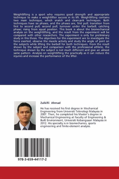 Weightlifting is a sport who requires good strength and appropriate technique to make a weightlifter success in its lift. Weightlifting contains two main technique, which snatch and clean-jerk techniques. Both techniques have six phases, and the phases are, first pull; transition from first to second pull; second pull; turnover under the barbell; catching phase; rising from squat position. This book is about the biomechanical analysis on the weightlifting, and the result from the experiment will be compared with other researchers. The experiment is only for preliminary study in this thesis. The objectives for this experiment are to investigate the force exerted, observe the muscle activity and study the angle of joint on the subjects while lifting the barbell for both techniques. From the result shown by the subject and comparison with the professional athlete, the technique shown by the subject is not much different and give an almost same pattern. Analysis on weightlifting the practically as it can reduce the injuries and increase the performance of the lifter.