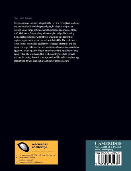 This quantitative approach integrates the basic concepts of mechanics and computational modelling techniques, in a logical progression through a wide range of fundamental biomechanics principles. Online MATLAB-based software along with examples and problems using biomedical applications will motivate undergraduate biomedical engineering students to practise and test their skills.