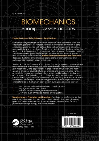 Biomechanics: Principles and Practices functions as a reference for the practicing professional as well as an introduction for the bioengineering graduate student with a focus in biomechanics, biodynamics, human performance engineering, and human factors.