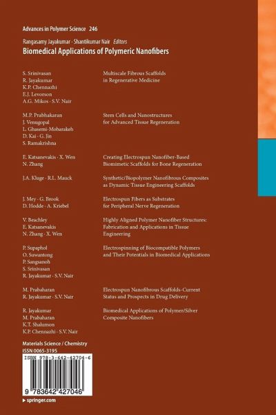 Multiscale Fibrous Scaffolds in Regenerative Medicine, by Sowmya Srinivasan, R. Jayakumar, K. P. Chennazhi, Erica J. Levorson, Antonios G. Mikos and Shantikumar V. Nair;Stem Cells and Nanostructures for Advanced Tissue Regeneration, by Molamma P. Prabhakaran, J. Venugopal, Laleh Ghasemi-Mobarakeh, Dan KaiGuorui Jin and Seeram Ramakrishna;Creating Electrospun Nanofiber-Based Biomimetic Scaffolds for Bone Regeneration, by Eleni Katsanevakis, Xuejun Wen and Ning Zhang;Synthetic/Biopolymer Nanofibrous Composites as Dynamic Tissue Engineering Scaffolds, by J. A. Kluge and R. L. Mauck; Electrospun Fibers as Substrates for Peripheral Nerve Regeneration, by Jörg Mey, Gary Brook, Dorothée Hodde and Andreas Kriebel; Highly Aligned Polymer Nanofiber Structures: Fabrication and Applications in Tissue Engineering, by Vince Beachley, Eleni Katsanevakis, Ning Zhang, Xuejun Wen;Electrospinning of Biocompatible Polymers and Their Potentials in Biomedical Applications, by Pitt Supaphol, Orawan Suwantong, Pakakrong Sangsanoh, Sowmya Srinivasan, Rangasamy Jayakumar and Shantikumar V. Nair;Electrospun Nanofibrous Scaffolds-Current Status and Prospects in Drug Delivery, by M. Prabaharan, R. Jayakumar and S. V. Nair.;Biomedical Applications of Polymer/Silver Composite Nanofibers, by R. Jayakumar, M. Prabaharan, K. T. Shalumon, K. P. Chennazhi and S. V. Nair.-