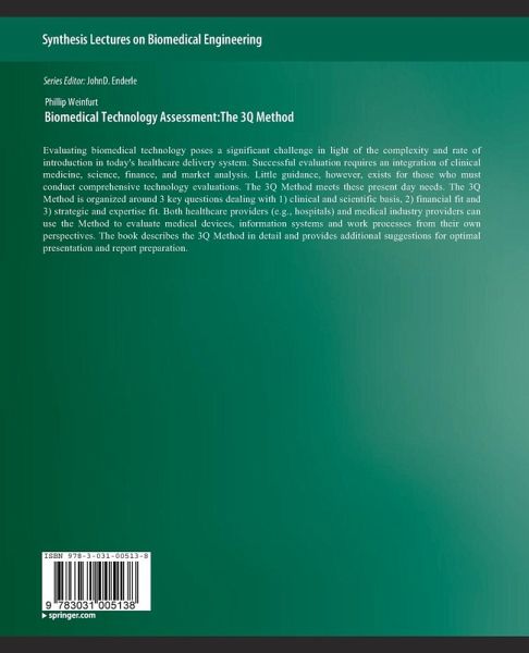 Evaluating biomedical technology poses a significant challenge in light of the complexity and rate of introduction in today's healthcare delivery system. Successful evaluation requires an integration of clinical medicine, science, finance, and market analysis. Little guidance, however, exists for those who must conduct comprehensive technology evaluations. The 3Q Method meets these present day needs. The 3Q Method is organized around 3 key questions dealing with 1) clinical and scientific basis, 2) financial fit and 3) strategic and expertise fit. Both healthcare providers (e.g., hospitals) and medical industry providers can use the Method to evaluate medical devices, information systems and work processes from their own perspectives. The book describes the 3Q Method in detail and provides additional suggestions for optimal presentation and report preparation. Table of Contents: Introduction / Question #1: Is It Real? / Question #2: Can We Win? / Question #3: Is It Worth It? / 3QCaseStudy Example -- Pershing Medical Company / Appendix A: Health Care Technology Assessment Sample Class Syllabus / Appendix B: How do Hospitals and Clinicians Get Paid? / Appendix C: Technology Assessment PowerPoint Report Guidelines / Appendix D: Class Report Scenario Example / Appendix E: Four-Blocker Slide Templates for 3Q Reports
