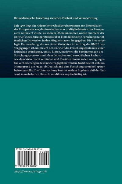 Inhaltverzeichnis.- A. Sachverhalt und Fragestellung.- I. Sachverhalt.- II. Fragestellung.- B. Rechtliche Stellungnahme.- I. Grundfragen.- II. Materiell-verfassungsrechtliche Rahmenbedingungen des Forschungsprotokolls.- III. Klärung des Anwendungsbereichs des Forschungsprotokolls.- IV. Das Schutzkonzept des Forschungsprotokolls: Kumulative Wirkung verschiedener Schutzelemente.- V. Würdigung einzelner Bestimmungen und Regelungskomplexe des Forschungsprotokolls.- C. Abschließende Bewertung und Zusammenfassung.- I. Zusammenfassende Beurteilung.- II. Einzelkritik und Verbesserungsvorschläge.- Vergleich der Regeln des Forschungsprotokolls (FP) mit den Regelnder Menschenrechtskonvention zur Biomedizin des Europarates (MRB), des AMG, MPG, TFG, der StrSchV, der Arzneimittlerichtlinie (AMRL) sowie der Revidierten Deklaration von Helsinki (RDH)(Fassung Okt. 2000).- Tabelle la: Schutzkriterien bei Forschung an Einwilligungsfähigen.- Tabelle lb: Detailübersicht zum Umfang der erforderlichen Aufklärung bei Forschung an Einwilligungsfähigen.- Tabelle lc: Detailübersicht zu den Anforderungen an die Informationen für die Ethikkommision bei Forschung an Einwilligungsfähigen.- Tabelle 2: Spezielle Regelungen zur Forschung an Einwilligungsunfähigen.- Draft additional Protocol to the Convention on Human Rights and Biomedicine, on Biomedical Research.- Draft Explanatory Report to the draft additional Protocol.- Entwurf eines Zusatzprotokolls zum Übereinkommen über Menschenrechte und Biomedizin über biomedizinische Forschung (Vorläufige nicht verbindliche Arbeitsübersetzung des BMJ).- Entwurf eines Erläuternden Berichts zum Entwurf eines Zusatzprotokolls (Vorläufige nicht verbindliche Arbeitsübersetzung des BMJ).