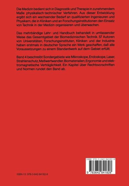 Die Medizin bedient sich in der Diagnostik und Therapie in zunehmendem Maße physikalisch-technischer Verfahren. Aus dieser Entwicklung ergibt sich ein wachsender Bedarf an qualifizierten Ingenieuren und Physikern, die in Kliniken und an Forschungsinstitutionen den Einsatz von Technik in der Medizin organisieren und überwachen. Das vierbändige Lehr- und Handbuch behandelt in umfassender Weise das Gesamtgebiet der biomedizinischen Technik. 57 Autoren von Universitäten, Forschungsinstituten, Kliniken und der Industrie haben erstmals in deutscher Sprache ein Werk geschaffen, das alle Voraussetzungen zu einem Standardwerk auf dem Gebiet erfüllt. Band 4 beschreibt Sondergebiete wie Mikroskope, Endoskope, Laser, Strahlenschutz, Meßwertwandler, Biomaterialien, Ergonomie und elektromagnetische Verträglichkeit. Ein Kapitel über Rechtsvorschriften und Normen runden den Band ab. Die weiteren Bände behandeln Diagnostik und bildgebende Verfahren (Band 1), Therapie und Rehabilitation (Band 2) sowie Signal- und Datenverarbeitung und Medizinische Sondergebiete (Band 3).