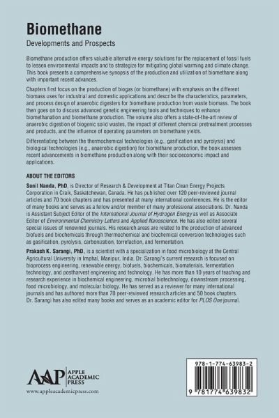 Sonil Nanda, PhD, is Director of Research & Development at Titan Clean Energy Projects Corporation in Craik, Saskatchewan, Canada. He has published over 120 peer-reviewed journal articles and 70 book chapters and has presented at many international conferences. He is the editor of many books and serves as a fellow and/or member of many professional associations. Dr. Nanda is Assistant Subject Editor of the International Journal of Hydrogen Energy as well as Associate Editor of Environmental Chemistry Letters and Applied Nanoscience. He has also edited several special issues of renowned journals. His research areas are related to the production of advanced biofuels and biochemicals through thermochemical and biochemical conversion technologies such as gasification, pyrolysis, carbonization, torrefaction, and fermentation. Prakash K. Sarangi, PhD, is a scientist with a specialization in food microbiology at the Central Agricultural University in Imphal, Manipur, India. Dr. Sarangi's current research is focused on bioprocess engineering, renewable energy, biofuels, biochemicals, biomaterials, fermentation technology, and postharvest engineering and technology. He has more than 10 years of teaching and research experience in biochemical engineering, microbial biotechnology, downstream processing, food microbiology, and molecular biology. He has served as a reviewer for many international journals and has authored more than 70 peer-reviewed research articles and 50 book chapters. Dr. Sarangi has also edited many books and serves as an academic editor for PLOS One journal.