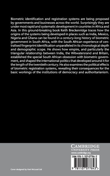 Biometric identification and registration systems are being proposed by governments and businesses across the world. Surprisingly they are under most rapid, and systematic, development in countries in Africa and Asia. In this groundbreaking book, Keith Breckenridge traces how the origins of the systems being developed in places like India, Mexico, Nigeria and Ghana can be found in a century-long history of biometric government in South Africa, with the South African experience of centralized fingerprint identification unparalleled in its chronological depth and demographic scope. He shows how empire, and particularly the triangular relationship between India, the Witwatersrand and Britain, established the special South African obsession with biometric government, and shaped the international politics that developed around it for the length of the twentieth century. He also examines the political effects of biometric registration systems, revealing their consequences for the basic workings of the institutions of democracy and authoritarianism.