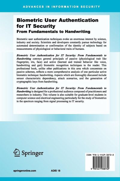 Biometric User Authentication for IT Security: From Fundamentals to Handwriting conveys general principals of passive (physiological traits such as fingerprint, iris, face) and active (learned and trained behavior such as voice, handwriting and gait) biometric recognition techniques to the reader. Unlike other publications in this area that concentrate on passive schemes, this professional book reflects a more comprehensive analysis of one particular active biometric technique: handwriting. Aspects that are thoroughly discussed include sensor characteristic dependency, attack scenarios, and the generation of cryptographic keys from handwriting.