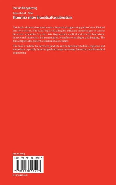 This book addresses biometrics from a biomedical engineering point of view. Divided into five sections, it discusses topics including the influence of pathologies on various biometric modalities (e.g. face, iris, fingerprint), medical and security biometrics, behavioural biometrics, instrumentation, wearable technologies and imaging. The final chapters also present a number of case studies. The book is suitable for advanced graduate and postgraduate students, engineers and researchers, especially those in signal and image processing, biometrics, and biomedical engineering.