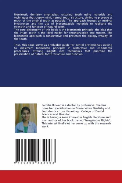 Biomimetic dentistry emphasizes restoring teeth using materials and techniques that closely mimic natural tooth structure, aiming to preserve as much of the original tooth as possible. This approach focuses on minimal invasiveness and the use of biocompatible materials to replicate the strength and function of natural teeth.The core philosophy of this book is the biomimetic principle- the idea that the intact tooth is the ideal model for reconstruction and success. The biomimetic approach is conservative and preserves the biology (vitality) of the tooth.Thus, this book serves as a valuable guide for dental professionals seeking to implement biomimetic principles in restorative and endodontic procedures, offering insights into techniques that prioritize the preservation of natural tooth structure and function.