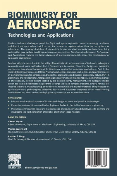 Readers will get a deep dive into the utility of biomimetics to solve a number of technical challenges in aeronautics and space exploration. Part I: Biomimicry in Aerospace: Education, Design, and Inspiration provides an educational background to biomimicry applied for aerospace applications. Part II: Biomimetic Design: Aerospace and Other Practical Applications discusses applications and practical aspects of biomimetic design for aerospace and terrestrial applications and its cross-disciplinary nature. Part III: Biomimicry and Foundational Aerospace Disciplines covers snake-inspired robots, biomimetic advances in photovoltaics, electric aircraft cooling by bioinspired exergy management, and surrogate model-driven bioinspired optimization algorithms for large-scale and complex problems. Finally, Part IV: Bio-Inspired Materials, Manufacturing, and Structures reviews nature-inspired materials and processes for space exploration, gecko-inspired adhesives, bioinspired automated integrated circuit manufacturing on the Moon and Mars, and smart deployable space structures inspired by nature.