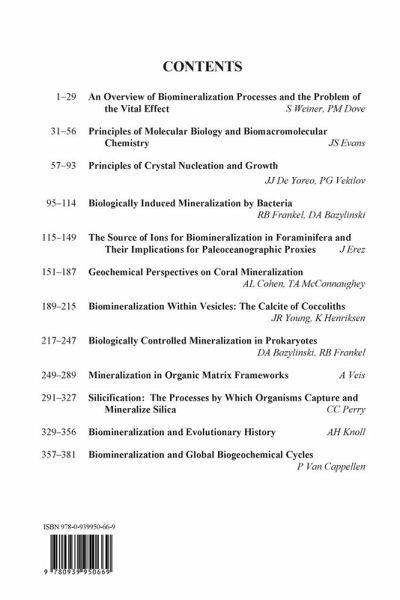Volume 54 of Reviews in Mineralogy and Geochemistry focuses upon the various processes by which organisms direct the formation of minerals. Our framework of examining biominerals from the viewpoints of major mineralization strategies distinguishes this volume from most previous reviews. The review begins by introducing the reader to over-arching principles that are needed to investigate biomineralization phenomena and shows the current state of knowledge regarding the major approaches to mineralization that organisms have developed over the course of Earth history. By exploring the complexities that underlie the "synthesis" of biogenic materials, and therefore the basis for how compositions and structures of biominerals are mediated (or not), we believe this volume will be instrumental in propelling studies of biomineralization to a new level of research questions that are grounded in an understanding of the underlying biological phenomena.