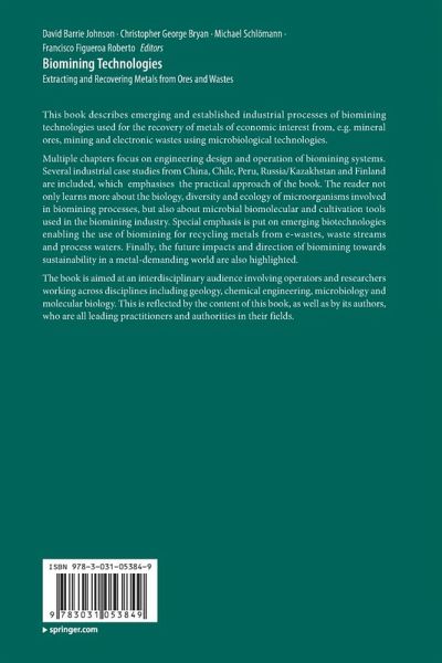 Multiple chapters focus on engineering design and operation of biomining systems. Several industrial case studies from China, Chile, Peru, Russia/Kazakhstan and Finland are included, which emphasises the practical approach of the book. The reader not only learns more about the biology, diversity and ecology of microorganisms involved in biomining processes, but also about microbial biomolecular and cultivation tools used in the biomining industry. Special emphasis is put on emerging biotechnologies enabling the use of biomining for recycling metals from e-wastes, waste streams and process waters. Finally, the future impacts and direction of biomining towards sustainability in a metal-demanding world are also highlighted.